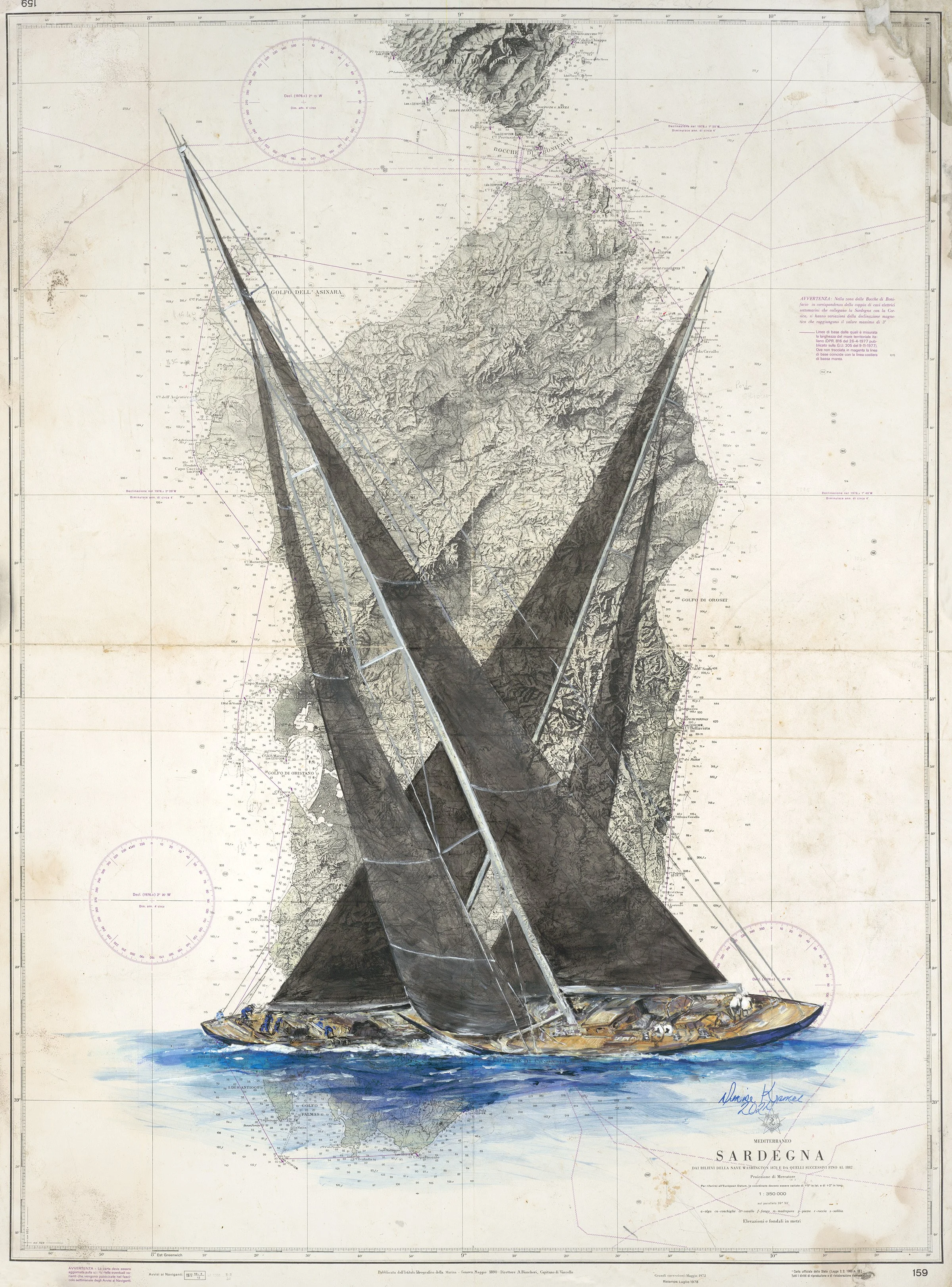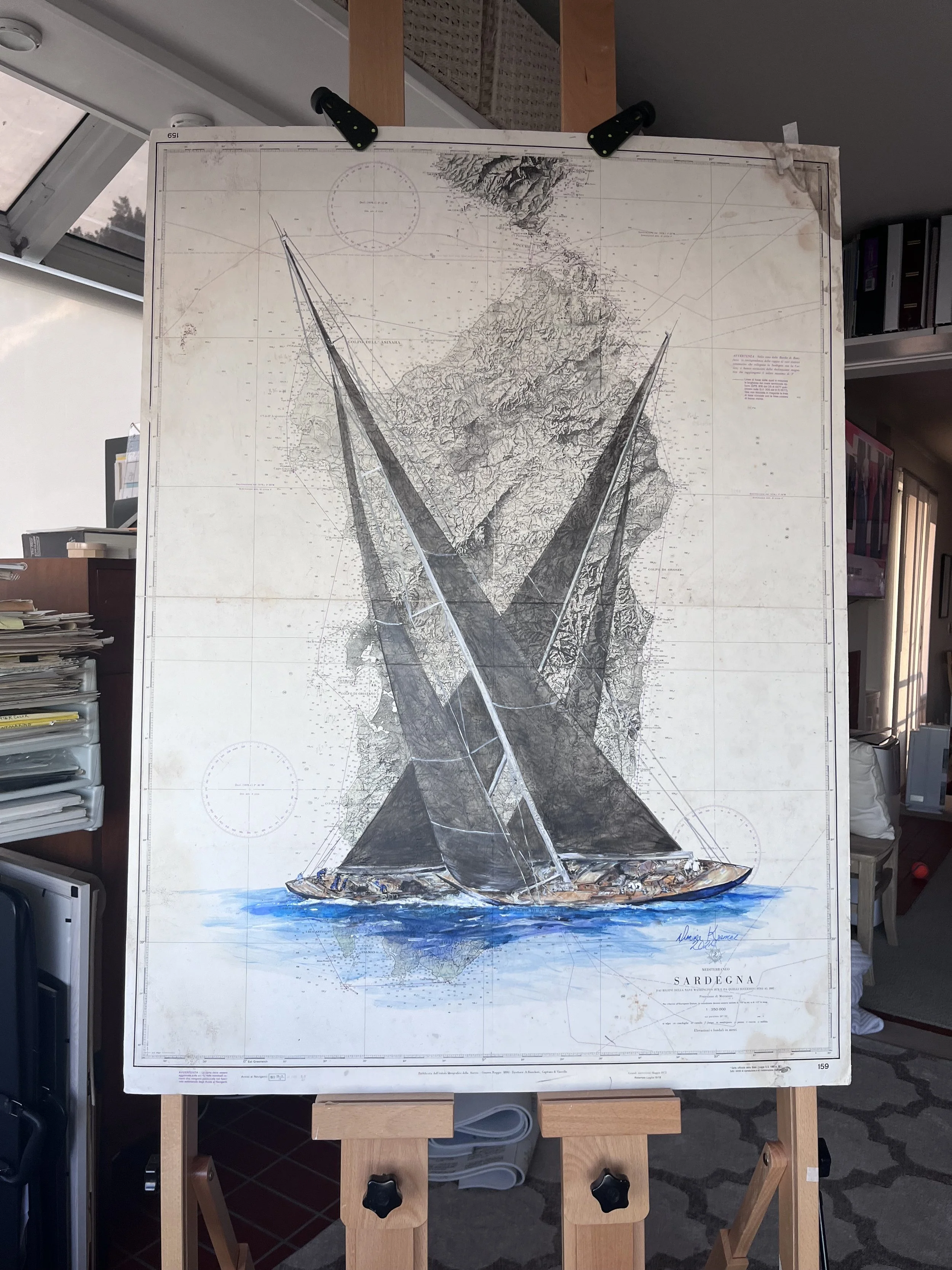 The backdrop of this artwork is an antique nautical chart of Sardinia, its aged patina provides a history-rich canvas that grounds the painting in maritime legacy. The delicate hues and markings of the chart create a compelling contrast with the vividness of the boats.